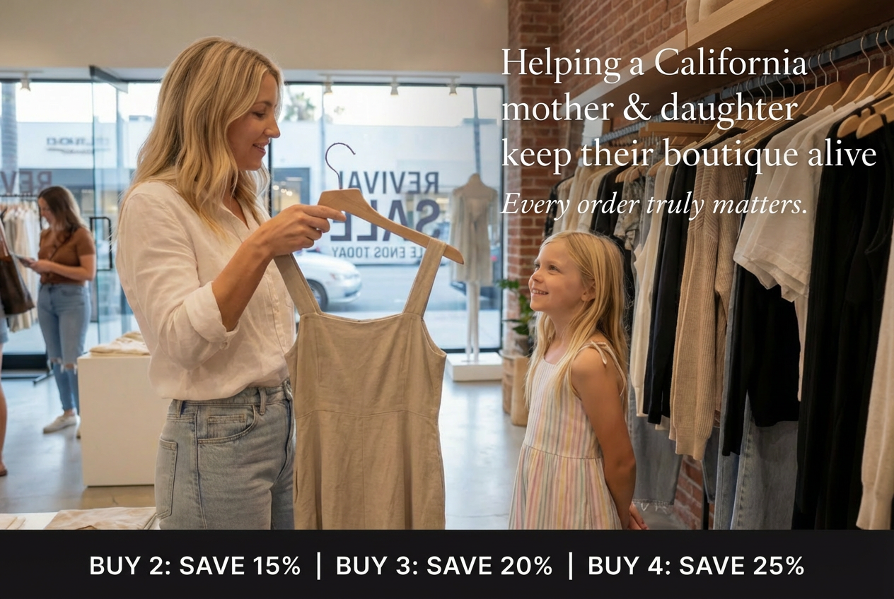 Every single order truly matters. Every purchase helps us keep moving forward, support our team, and give Emilia Boutique California the chance to grow stronger again.